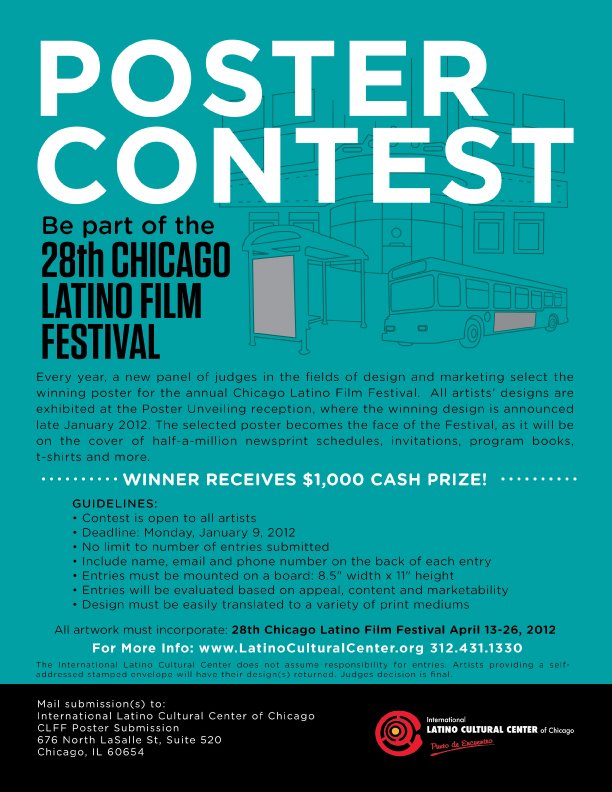 The annual Chicago Latino Film Festival poster contest is officially open for entries! This is a great platform for artists, and the winner always gets tons of exposure (not to mention a $1,000 prize). The deadline is Monday, January 9th, so check out complete entry guidelines below, and good luck!
