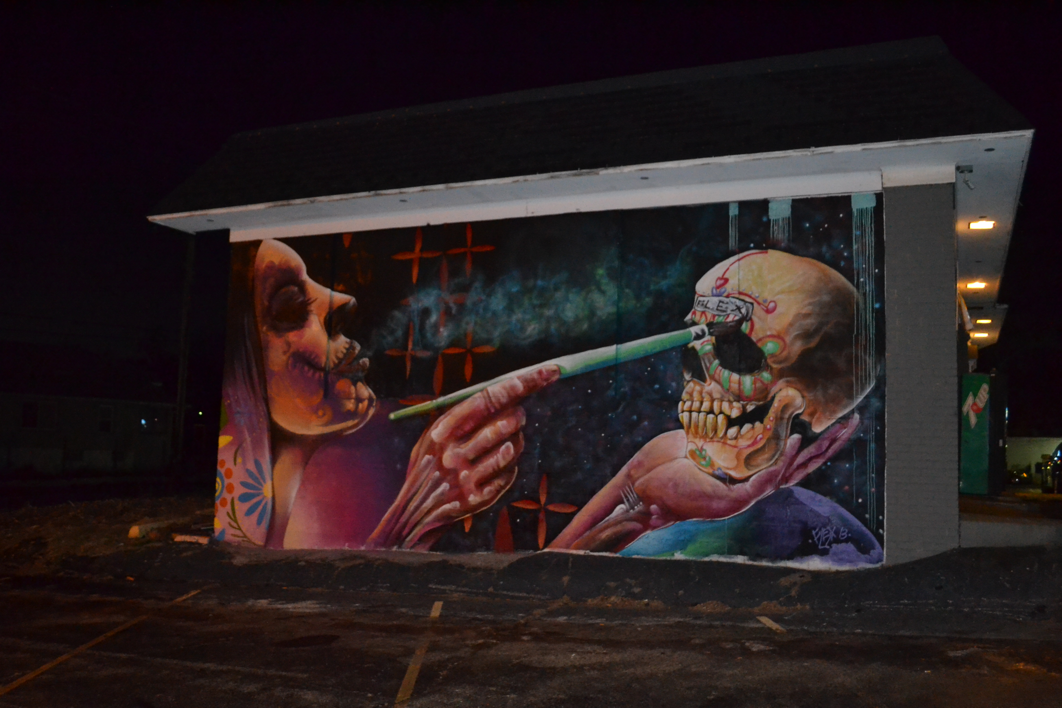 Needless to say, it was dark by the time we got to Miller Beach. And I wasn’t exactly sure what to look for or where. We saw a few street art pieces on the walls, and then went into Lake Street Gallery, the only place still open on Lake Street. The shop had a variety of art and crafts from local artists, including really wooden panel pieces hanging on the walls. Plus, the owner was super nice and steered us towards the hidden art, which could be found on the backs of buildings in the alleys. Although he assured us it was safe and we could probably walk back through the alleys with no problems, we decided to drive through them in my car instead. Safety first.